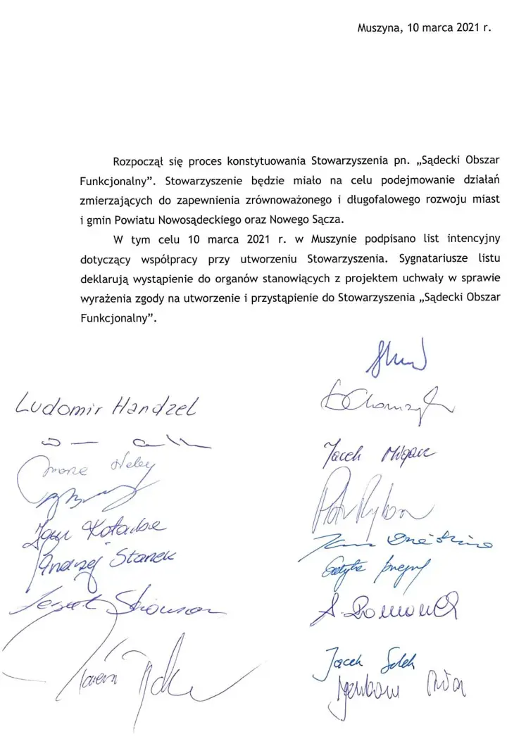 10 marca br. w Muszynie prezydent Ludomir Handzel podpisał razem z 16 burmistrzami i wójtami gmin i miast powiatu nowosądeckiego statut Stowarzyszenia Sądeckiego Obszaru Funkcjonalnego. Będzie to platforma współpracy dla wszystkich jednostek samorządu terytorialnego powiatu nowosądeckiego.