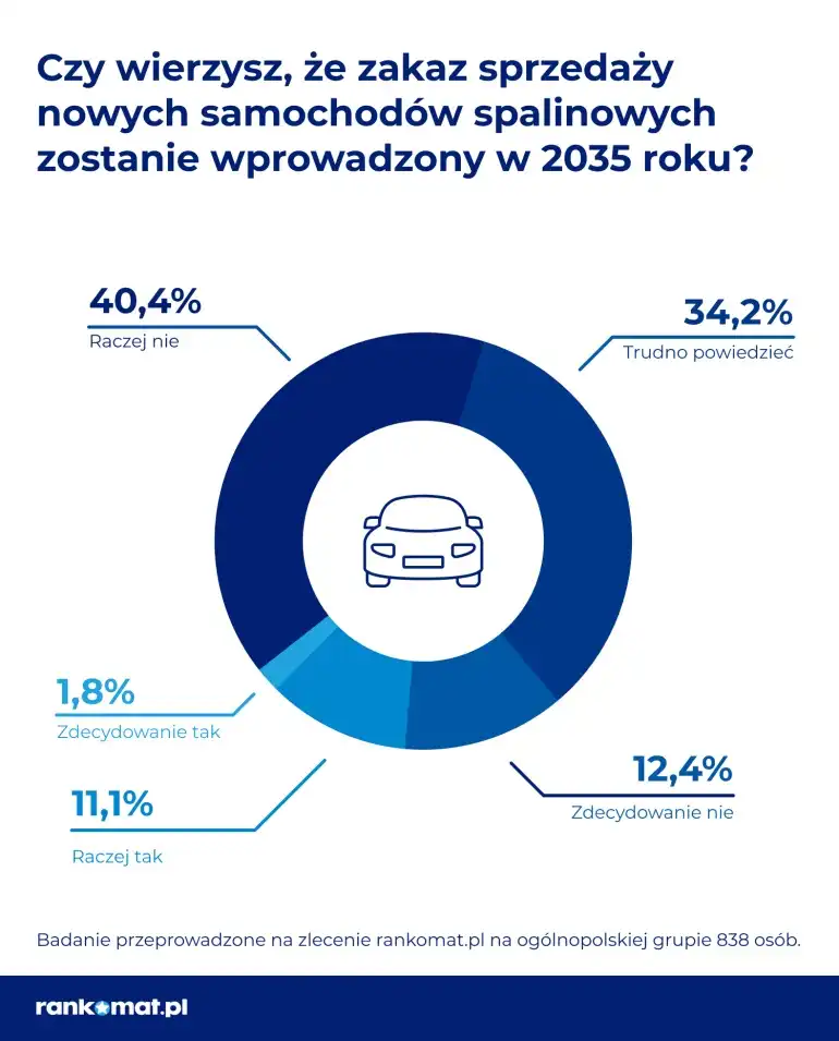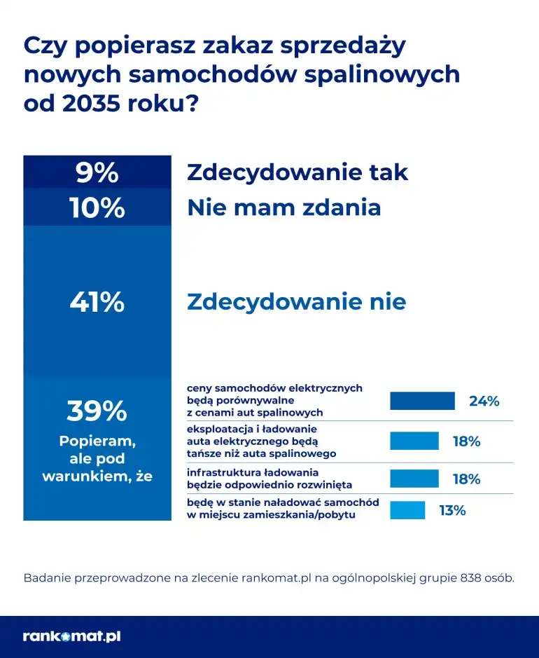 Z badania przeprowadzonego przez multiporównywarkę rankomat.pl wynika, że zaledwie 9% ankietowanych popiera zakaz sprzedaży nowych samochodów spalinowych od 2035 roku. Powodem tego może być zbyt wygórowana jak na polskie realia cena aut eco. Gdyby na dzień dzisiejszy uczestnicy badania mieli przesiąść się do samochodu elektrycznego, co trzeci z nich nie miałby na to wystarczającego budżetu.