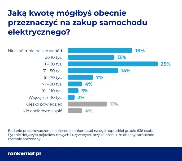 Nowy samochód elektryczny ma szansę kupić zaledwie 9% badanych. Są to osoby, które dysponują kwotą powyżej 70 tys. złotych. Najtańsze auta elektryczne kosztują ponad 100 tys. złotych, przy czym koszt zakupu może być niższy po skorzystaniu z dopłaty „Mój elektryk” oraz z Karty Dużej Rodziny.