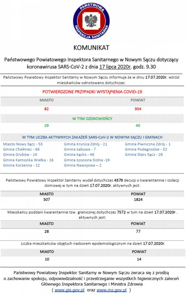 W poniższym komunikacie PSSE w Nowym Sączu prezentujemy liczbę zakażonych w rozbiciu na miasto i gminy.