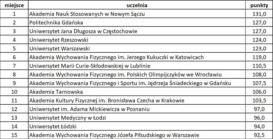 Po tych spektakularnych wynikach, Akademia Nauk Stosowanych w Nowym Sączu awansowała na pierwsze miejsce w krajowym rankingu uczelni sportowych, co stanowi ogromny sukces dla uczelni i jej studentów (poniżej pierwsza piętnastka rankingu):