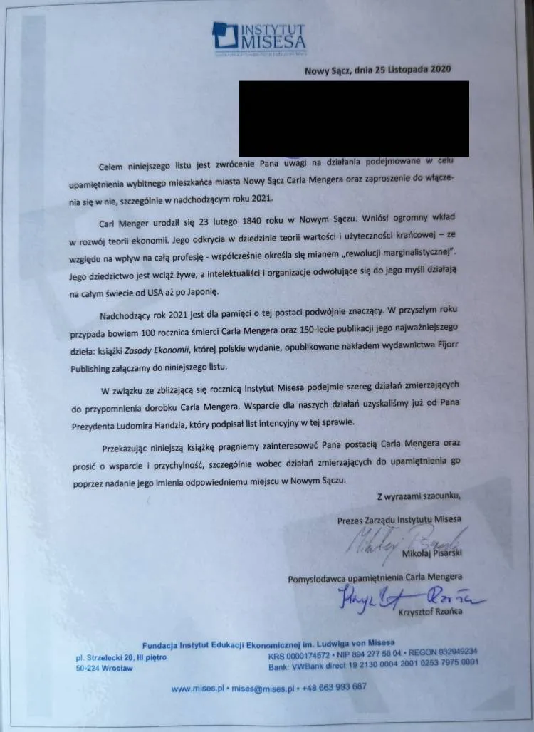 Wszystkim Radnym z którymi miałem przyjemność się spotkać i porozmawiać bardzo dziękuję! Nadchodzący rok 2021 jest dla pamięci o tej postaci podwójnie znaczący. Przypada bowiem 100 rocznica śmierci Carla Mengera oraz 150-lecie publikacji jego najważniejszego dzieła - książki Zasady Ekonomii. Mam ogromną nadzieję, że już na początku 2021 roku uda nam się wspólnie nadać jego imieniem odpowiednie miejsce w Nowym Sączu. Liczę, że w ten symboliczny sposób będziemy mogli rozpocząć szereg działań, które przyczynią się do przypomnienia o tej postaci. Naszym celem jest wzrost świadomości ekonomicznej wśród Polaków, a edukację w tym zakresie uważamy za kluczową. Wpływ Carla Mengera w tej dziedzinie nauki jest tak ogromny, że z pewnością nasze działania zmierzające do upamiętnienia Mengera w mieście jego narodzin, przybliżą nas do tego celu
