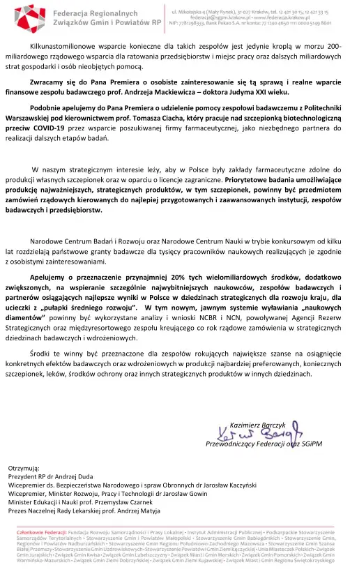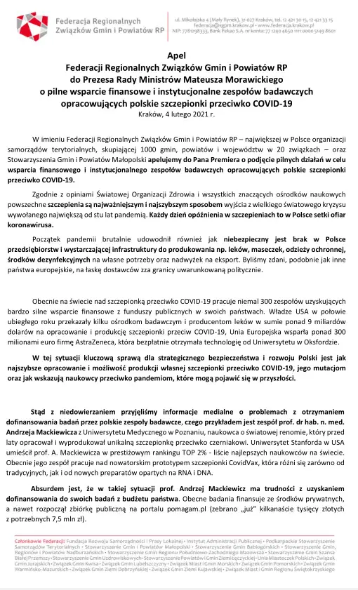 Apel Federacji Regionalnych Związków Gmin i Powiatów RP do Prezesa Rady Ministrów Mateusza Morawickiego o pilne wsparcie finansowe i instytucjonalne zespołów badawczych opracowujących polskie szczepionki przeciwko COVID-19.