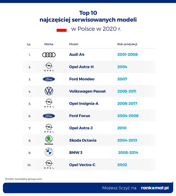 Jakie modele aut były najczęściej serwisowane w Polsce w 2020 roku?