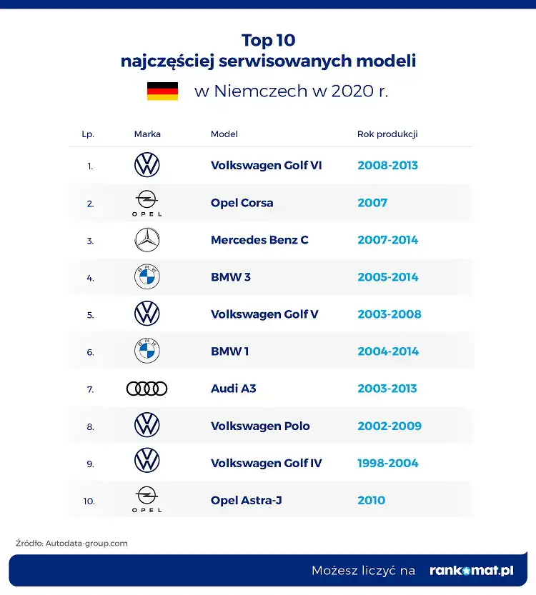 Za zachodnią granicą w ubiegłym roku najczęściej serwisowane były nieco inne modele niż w Polsce. W rankingu Autodata w niemieckim top 10 serwisowanych samochodów osobowych pierwsze miejsce zajął Volkswagen Golf VI (2008-2013). Na kolejnych miejscach podium znalazły się Opel Corsa (2007) oraz Mercedes Benz C (2007-2014).