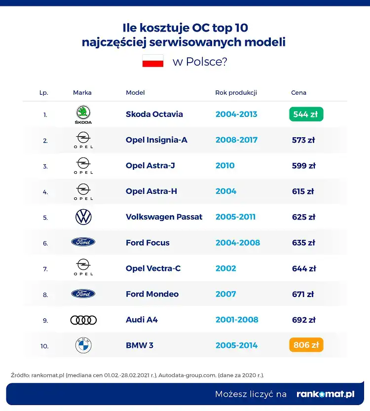 Wśród 10 najczęściej serwisowanych w Polsce samochodów osobowych, zdecydowanie najwięcej za ubezpieczenie oc muszą zapłacić właściciele BMW Serii 3 z lat 2005-2014 (średnio 806 zł). To o 32,3% więcej niż w przypadku najtańszej w zestawieniu Skody Octavii (544 zł). Różnica w wysokości cen pomiędzy markami wynosi 262 zł – wynika z kalkulacji przeprowadzonych przez użytkowników porównywarki rankomat.pl.