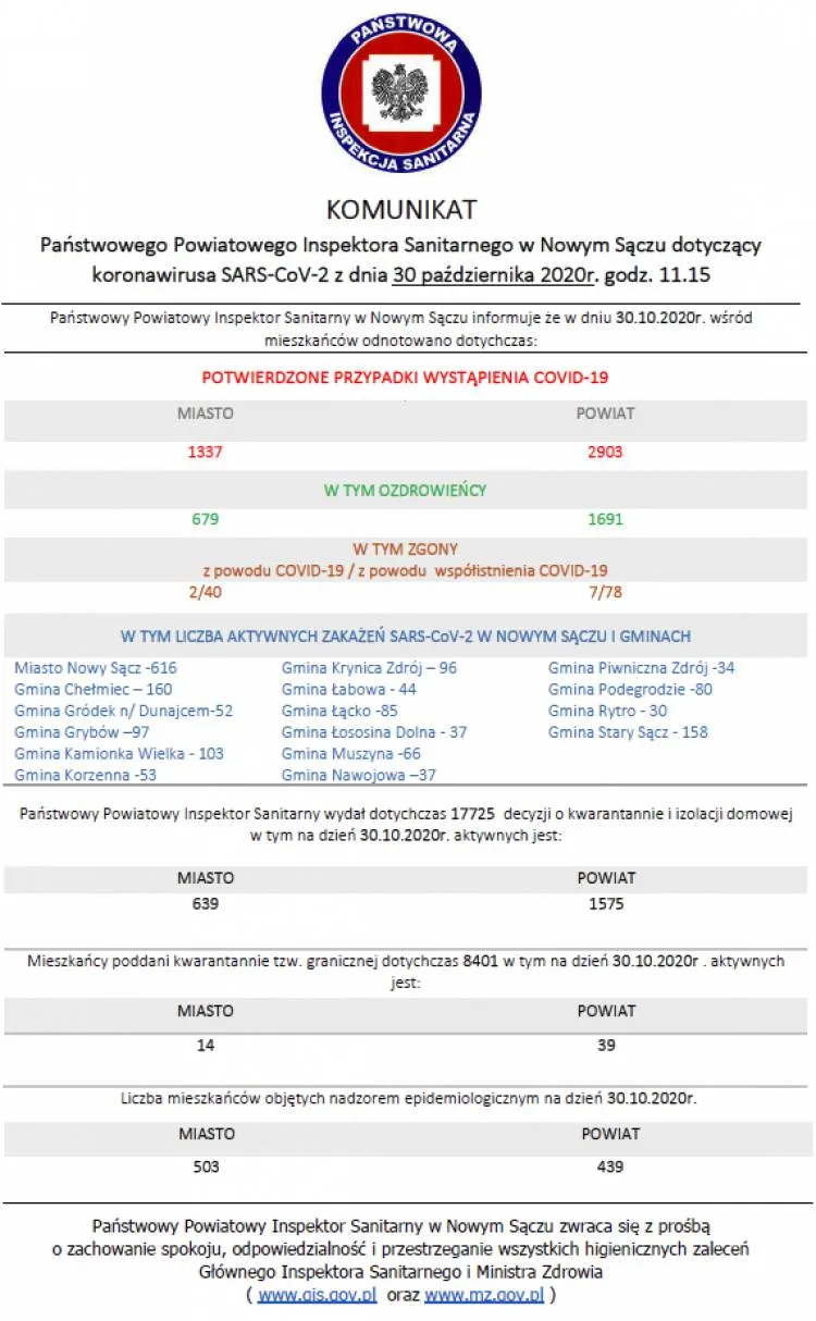 Ostatnie badania laboratoryjne potwierdziły zakażenie koronawirusem SARS-CoV-2 u kolejnych 1916 osób, z Krakowa (516), powiatu nowosądeckiego (147), wadowickiego (141), Nowego Sącza (100), powiatu krakowskiego (100), limanowskiego (89), bocheńskiego (70), oświęcimskiego (70), nowotarskiego (68), olkuskiego (65), tarnowskiego (63), chrzanowskiego (56), Tarnowa (54), powiatu dąbrowskiego (54), gorlickiego (53), suskiego (51), miechowskiego (43), proszowickiego (43), myślenickiego (40), tatrzańskiego (34), wielickiego (33) oraz brzeskiego (26). Aktualnie 46 osób jest hospitalizowanych, pozostałe przebywają w izolacji. Obecnie w Małopolsce zakażenie koronawirusem zostało potwierdzone u 41 531 osób.