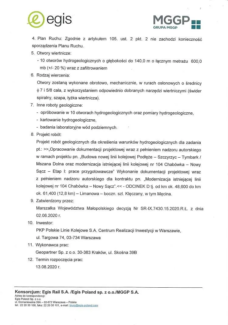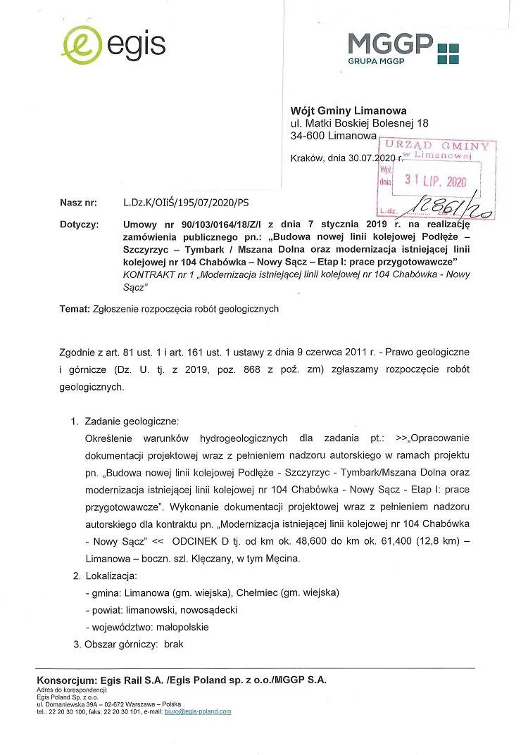 31 lipca do Urzędu Gminy Limanowa wpłynęła informacja od Wykonawcy dotycząca zgłoszenia rozpoczęcia robót geologicznych, w związku z zadaniem pn. "Budowa linii kolejowej Podłęże - Szczyrzyc - Tymbark/Mszana Dolna oraz modernizacja istniejącej linii kolejowej nr 104 Chabówka - Nową Sącz - Etap I:prace przygotowawcze" KONTRAKT nr 1 "Modernizacja istniejącej linii kolejowej nr 104 Chabówka-Nowy Sącz".