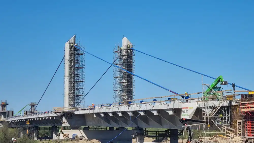 Jak informuje GDDKiA, na pylonie mostu, od strony miasta Nowy Sącz, po obydwu stronach pomostu, została już zamontowana pierwsza wanta.