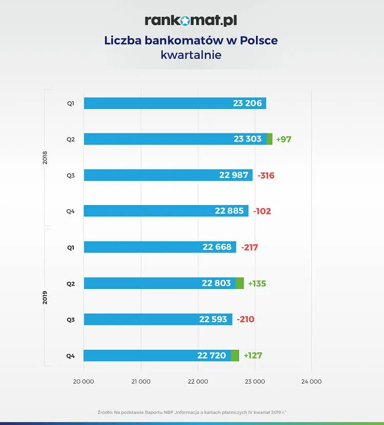 Eksperci rankomat.pl przyjrzeli się danym NBP z których wynika, że liczba bankomatów w Polsce na przestrzeni ośmiu ostatnich kwartałów spada. W pierwszym kwartale 2018 r. na rynku znajdowało się 23.206 maszyn tego typu. Natomiast na koniec 2019 roku ich liczba zmniejszyła się o 510 - do 22.720 sztuk. Niewykluczone, że banki dążące do redukcji kosztów utrzymają ten trend w kolejnych kwartałach, co przełoży się na ograniczenie dostępu do bankomatów.