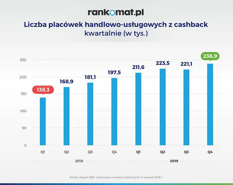 W tym samym okresie wyraźnie zwiększyła się liczba placówek handlowo-usługowych oferujących wypłaty sklepowe, tzw. cashback. W pierwszym kwartale 2018 r. rozwiązanie to oferowane było w 138 tys. punktów. Na koniec czwartego kwartału 2019 r. z usługi cashback można było skorzystać w 234 tys. placówek]. Stanowi wzrost o 69,6% na przestrzeni dwóch lat. Z danych wynika, że dostęp konsumenta do terminali POS, oferujących wypłaty sklepowe, powinien być znacznie łatwiejszy niż do bankomatów.