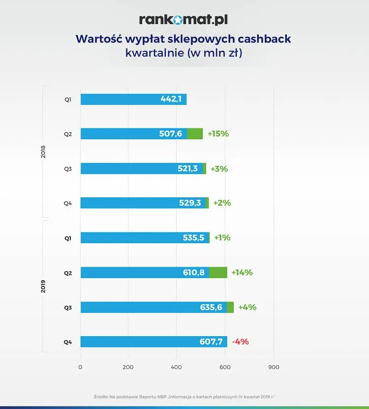 W tym samym okresie wartość wypłat sklepowych osiągnęła wartość 607,7 mln zł, zatem usługa cashback reprezentuje zupełnie inną kategorię - w porównaniu do bankomatów reprezentuje co najwyżej wagę piórkową. Warto jednak zwrócić uwagę na wyraźną tendencję wznoszącą na przestrzeni dwóch ostatnich lat. Zaobserwowany trend pozwala sądzić, że w kolejnych kwartałach wartość wypłat sklepowych będzie wzrastać, jednak będzie to w dalszym ciągu usługa uzupełniająca standardowe wypłaty z bankomatów.