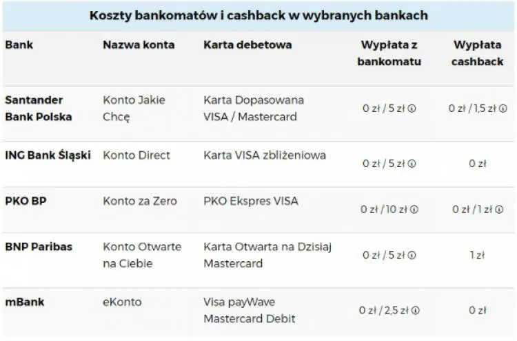 W celu oszacowania atrakcyjności omawianych rozwiązań, przygotowaliśmy tabelę porównującą koszty wypłat bankomatów i koszty cashback w pięciu bankach (infotipy zawierają szczegółowe informacje opisujące potencjalne obciążenia).