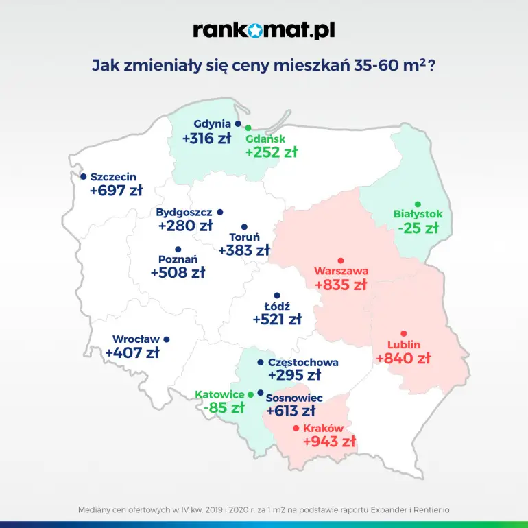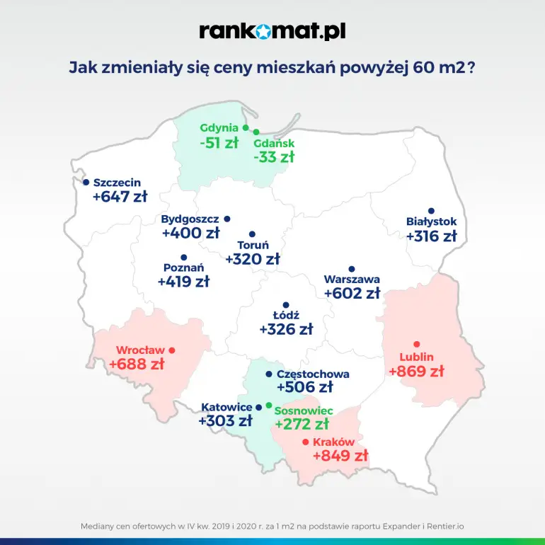 Na podstawie cyklicznych raportów Expander i Rentier.io eksperci rankomat.pl przeanalizowali ceny mieszkań w dwóch okresach. Koniec roku 2019, a więc jeszcze sprzed ogłoszonej przez WHO pandemii koronawirusa i koniec roku 2020, czyli okres obowiązujących obostrzeń sanitarnych, w tym zamrożenia gospodarki.