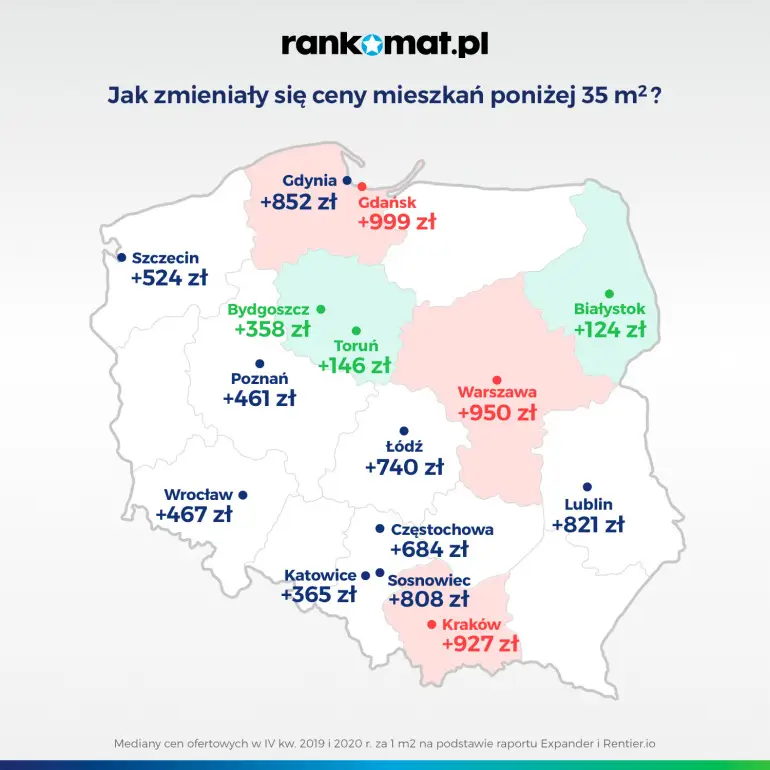 W pozostałych miastach małe mieszkania kosztują 8000 zł i mniej. Najdroższy jest Lublin (równo 8 000 zł) ze wzrostem na poziomie 821 zł. Następnie Szczecin i Katowice z podobną stawką (7 675 zł i 7 655 zł),ale innym tempem wzrostu (524 zł i 365 zł rocznie).