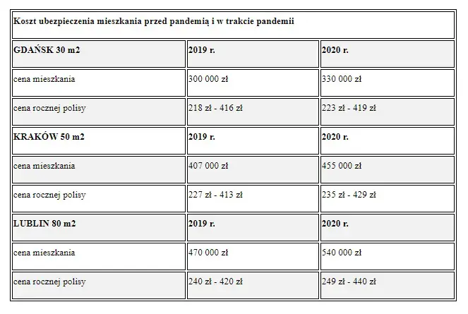 Do każdego z miast przepisano średnie ceny ofertowe według stawek przed pandemią i w jej trakcie. Zakres ochrony obejmuje dodatkowo wyposażenie i kradzież.