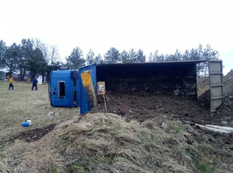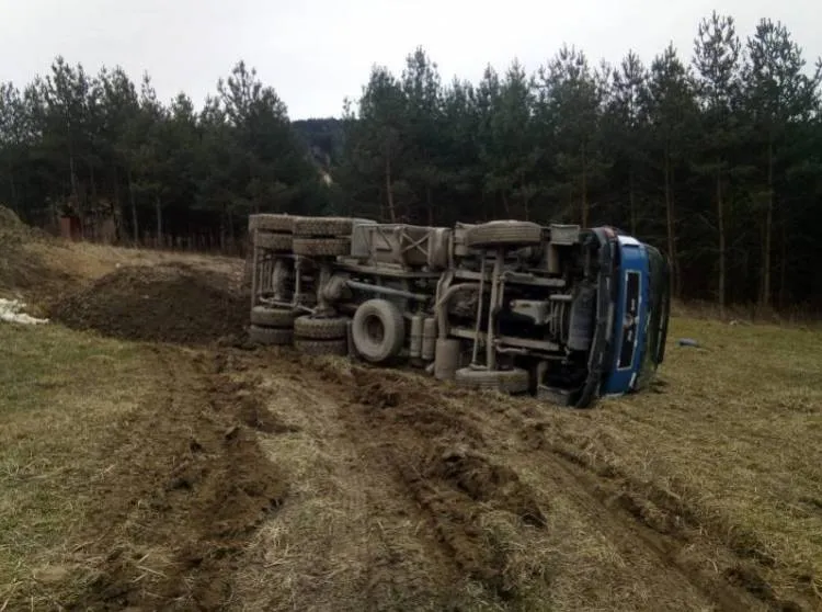 Do zdarzenia doszło na jednej z działek podczas wysypywania ziemi. Ciężarówka przewróciła się na lewy bok.