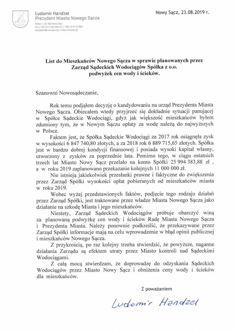 Prezydent apeluje, aby osoby odpowiedzialne za tą sytuacje ustąpiły ze swoich stanowisk. Zaznaczył również że celem spółki komunalnej nie jest tylko wypracowywanie zysku, ale dostarczanie usług w jak najniższej cenie dla ludzi, podkreślił również , że chce przywrócenia pierwotnych cen i odzyskania kontroli nad sądeckimi wodociągami.