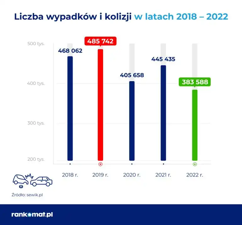 Dobrą wiadomością jest fakt, że na polskich drogach odnotowuje się coraz mniej kolizji i wypadków. Wg danych pochodzących z sewik.pl od 2018 roku jest ich mniej o ponad 83 tys., a w porównaniu do ubiegłego roku prawie 62 tys. mniej.