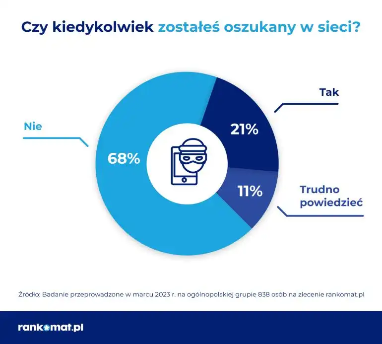 Z badania przeprowadzonego przez multiporównywarkę rankomat.pl wynika, że aż 68% Polaków twierdzi, że nikt nigdy nie oszukał ich online. Tylko 21% respondentów przyznało się, że doświadczyło jakiejś formy cyfrowego oszustwa, a 11% badanych nie było w stanie odpowiedzieć na to pytanie.