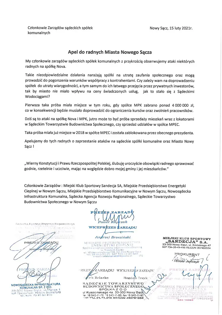 Pod apelem podpisali się członkowie Zarządów: MKS Sandecja, MPEC, MPK, Nowosądecka Infrastruktura Komunalna, SARR oraz Sądeckie Towarzystwo Budownictwa Społecznego w Nowym Sączu.