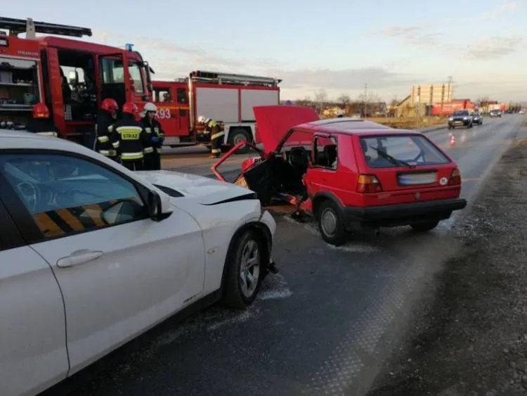 W wyniku kolizji czołowo bocznej poszkodowany został kierowca VW Golfa. Strażacy użyli sprzętu hydraulicznego, aby wydostać go z samochodu. Po wstępnym przebadaniu przez załogę karetki Pogotowia Ratunkowego został on przewieziony do szpitala.