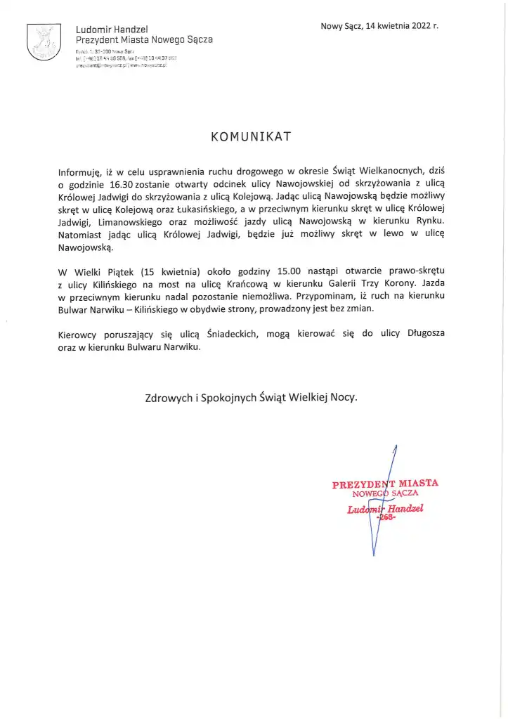 W celu usprawnienia ruchu drogowego w okresie Świąt Wielkanocnych władze miasta zdecydowały o otwarciu odcinka ulicy Nawojowskiej od skrzyżowania z ulicą Królowej Jadwigi do skrzyżowania z ulicą Kolejową.