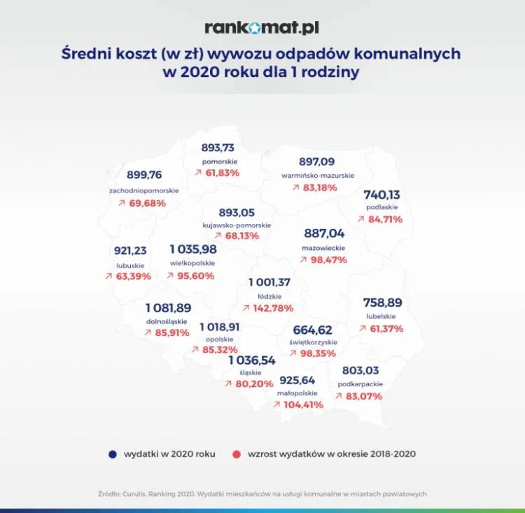 Najwyższe średnioroczne obciążenia tytułem odbioru segregowanych odpadów komunalnych dotykają mieszkańców województwa dolnośląskiego (1.081,89 zł),śląskiego (1.036,54 zł) i wielkopolskiego (1.035,98 zł). Z kolei w najkorzystniejszej sytuacji znajdują się mieszkańcy województwa lubelskiego (758,89 zł),podlaskiego (740,13 zł) i świętokrzyskiego (664,62 zł). Rzut oka na mapę pozwala zauważyć wyraźny podział, w którym mieszkańcy Polski wschodniej płacą zauważalnie mniej za odbiór odpadów komunalnych.