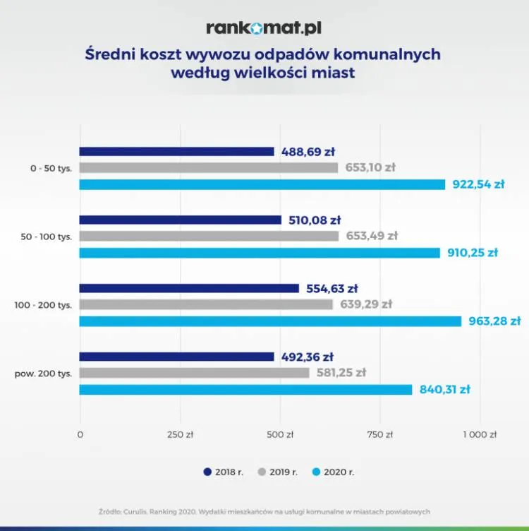 Podniesienie opłat za odbiór odpadów komunalnych w 2020 roku jest wyraźnie odczuwalne dla wszystkich mieszkańców, jednak największą dynamiką wzrostu cen cechują się małe i średnie miasta powiatowe. W stosunku do zeszłego roku najmocniej wzrosły koszty w ośrodkach liczących od 100 do 200 tys. mieszkańców – wzrost o 51%. W ujęciu dwuletnim największą dynamiką cechowały się miasta do 50 tys. mieszkańców – opłaty są wyższe o 89%.