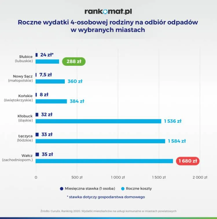 W 2020 roku najtańszym miastem w Polsce pod kątem kosztów związanych z odbiorem odpadów komunalnych są Słubice, gdzie miesięczne opłaty ustalane są dla gospodarstwa domowego i wnoszą 24 zł. Przekłada się to na obciążenie roczne dla całej rodziny w wysokości 288 zł. Z kolei najdroższym miastem jest Wałcz z miesięczną stawką za osobę równą 35 zł. Dla czteroosobowej rodziny oznacza roczny koszt w wysokości 1.680 zł.