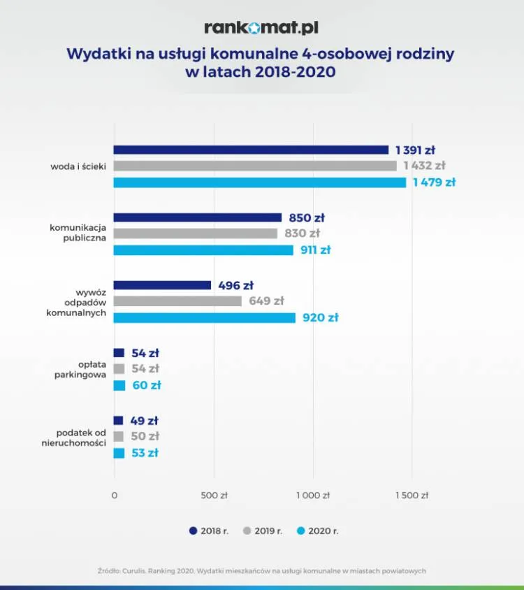 W 2020 roku przeciętna 4 osobowa rodzina zamieszkująca miasto powiatowe najwięcej pieniędzy przeznaczy na wodę i ścieki (43,21%) zakładając, że każdy domownik w ciągu roku zużywa 33,7 metra sześciennego wody i produkuje tyle samo ścieków. Najmniej domowy budżet obciążą opłaty parkingowe (1,55%),przy założeniu 48 godzin postoju pojazdu w centrum miasta w ciągu całego roku.