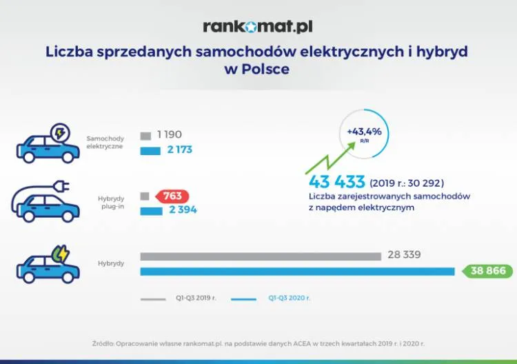 Najwyższym wzrostem sprzedaży w Polsce pochwalić się mogą producenci hybryd typu plug-in. Modele posiadające silnik spalinowo-elektryczny i dające możliwość ładowania pokładowej baterii z gniazdka, według danych ACEA, między styczniem a wrześniem 2020 roku znalazły blisko 2400 nabywców. Jako że w analogicznym okresie roku 2019 zbyt tego typu pojazdów w Polsce wyniósł 763 sztuki, rynek powiększył się o rekordowe 214 proc.