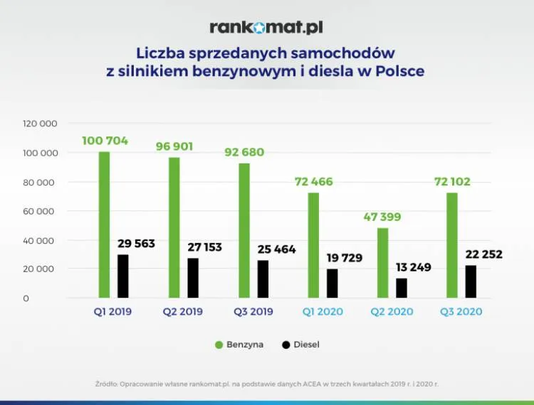 Kierowcy w Polsce interesują się samochodami ekologicznymi, a to w naturalny sposób musi się przełożyć na stratę dla napędów benzynowych i diesla. Między styczniem a wrześniem 2020 roku w Polsce sprzedały się blisko 192 tysiące pojazdów napędzanych motorem benzynowym. To o prawie 100 tysięcy sztuk mniej niż w analogicznym okresie roku 2019 (spadek o ok. 34 proc.). Diesle w tym czasie osiągnęły zbyt na poziomie 55 230 sztuk. Tym samym zainteresowanie napędami wysokoprężnymi zmalało o 32,8 proc. w stosunku do roku 2019.