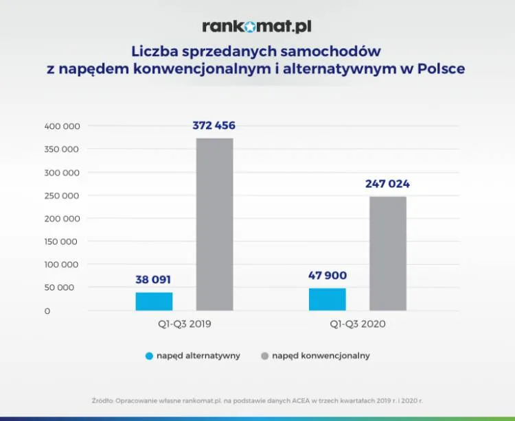 Pierwsze 9 miesięcy roku 2020 zakończyło się dla segmentu pojazdów o napędzie konwencjonalnym wynikiem na poziomie 247 024 sprzedanych sztuk. Spadek sprzedaży sięgnął tym samym 33,7 proc. Rynek e-pojazdów wygenerował natomiast w tym samym okresie wolumen oszacowany w raporcie ACEA na 47 900 sztuk, co oznacza wzrost o 25,8 proc.