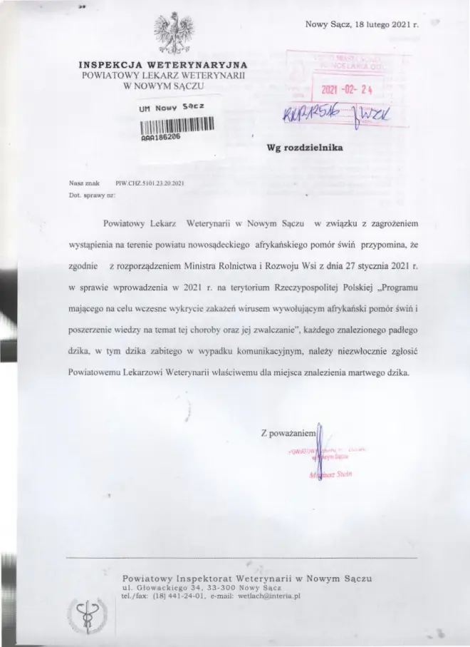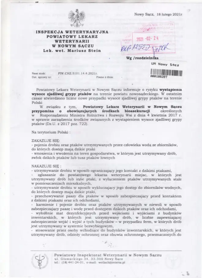 Powiatowy Lekarz Weterynarii w Nowym Sączu informuje o ryzyku wystąpienia wysoce zjadliwej grypy ptaków na terenie powiatu nowosądeckiego.