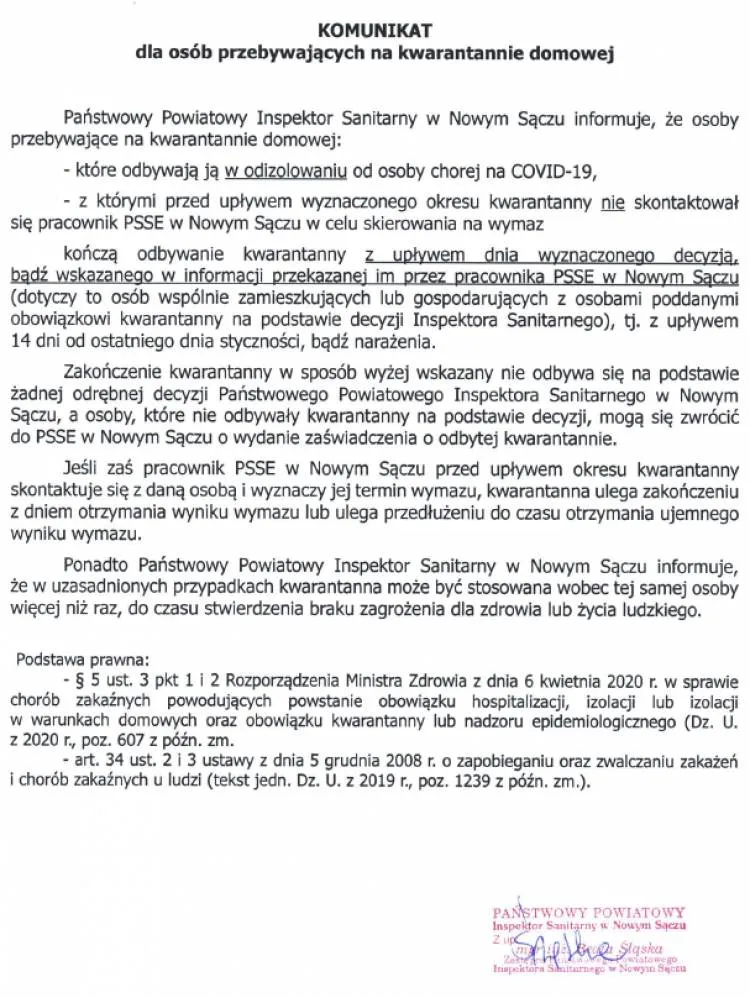 kończą odbywanie kwarantanny z upływem dnia wyznaczonego decyzją, bądź wskazanego w informacji przekazanej im przez pracownika PSSE w Nowym Sączu (dotyczy to osób wspólnie zamieszkujących lub gospodarujących z osobami poddanymi obowiązkowi kwarantanny na podstawie decyzji Inspektora Sanitarnego), tj. z upływem 14 dni od ostatniego dnia styczności, bądź narażenia.
