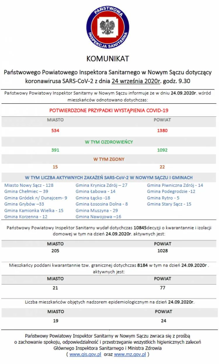 Ostatnie badania laboratoryjne potwierdziły zakażenie koronawirusem SARS-CoV-2 u kolejnych 183 osób. To 107 kobiet i 76 mężczyzn, w wieku od 7 do 89 lat, z Krakowa (35 osób), powiatu limanowskiego (29 osób), nowotarskiego (19 osób), krakowskiego (17 osób), tatrzańskiego (16 osób), suskiego (12 osób), myślenickiego (10 osób), wielickiego (8 osób), nowosądeckiego (6 osób), wadowickiego i chrzanowskiego (po 5 osób), olkuskiego (4 osoby), powiatów: tarnowskiego, proszowickiego, miechowskiego (po 3 osoby), Nowego Sącza i powiatów: oświęcimskiego, bocheńskiego (po 2 osoby) oraz Tarnowa i powiatu gorlickiego (po 1 osobie). Aktualnie 15 osób jest hospitalizowanych, pozostałe przebywają w izolacji. Obecnie w Małopolsce zakażenie koronawirusem zostało potwierdzone u 10 058 osób.