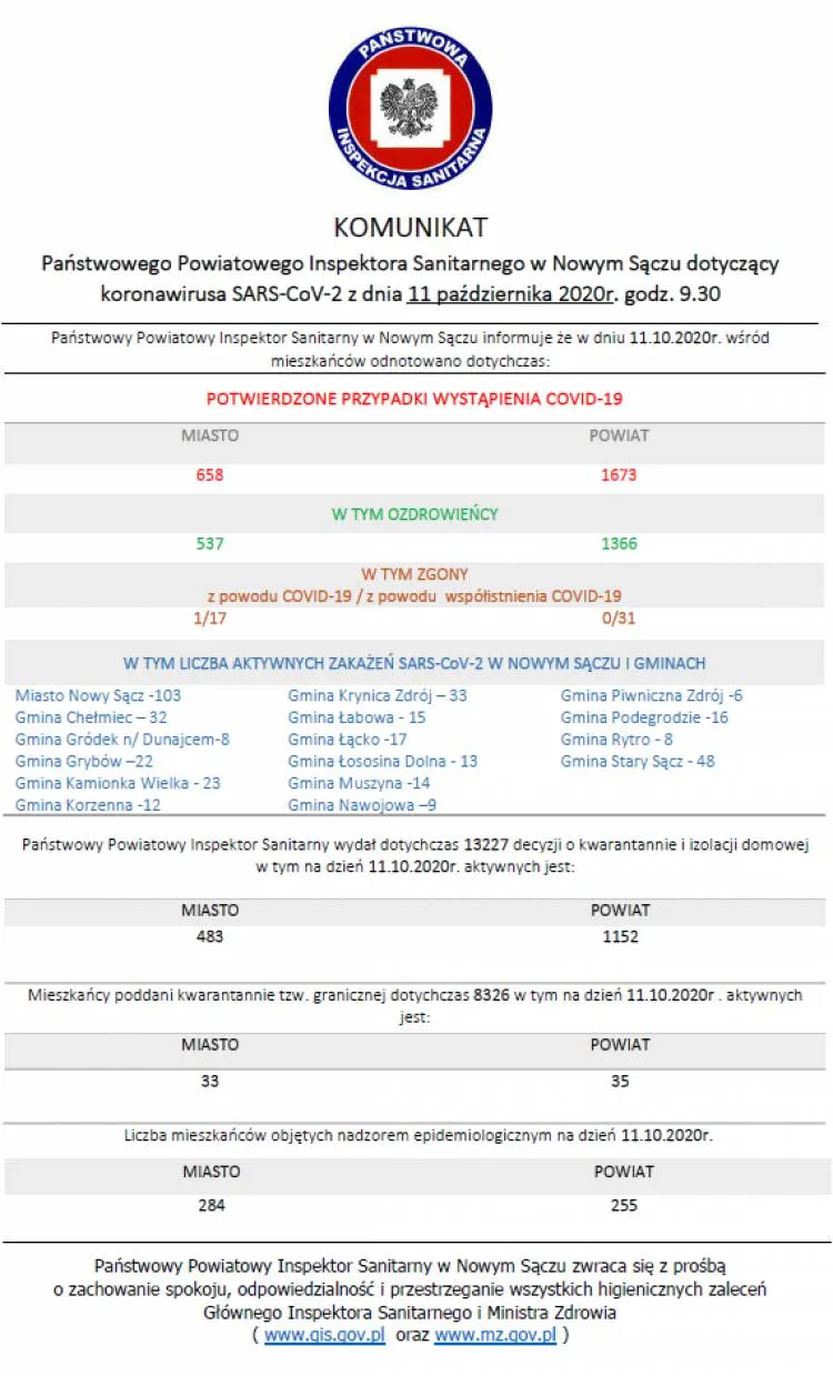 Dzisiaj na terenie powiatu nowosądeckiego odnotowano 35 kolejnych zakażeń wirusem SARS-CoV-2, a w mieście Nowy Sącz 14. Na Sądecczyźnie pojawiło się również 18 nowych ozdrowieńców. Niestety są też kolejne ofiary śmiertelne wirusa wśród których jest 74-letni mężczyzna z powiatu nowosądeckiego, który przebywał w Szpitalu w Krynicy-Zdroju i 64-letnia kobieta z powiatu nowosądeckiego, która przebywała w Szpitalu Uniwersyteckim w Krakowie. Z kolei w regionie, w powiecie limanowskim jest 29 nowych zachorowań, a w powiecie gorlickim 4. Pojawiło się także 19 ozdrowieńców.