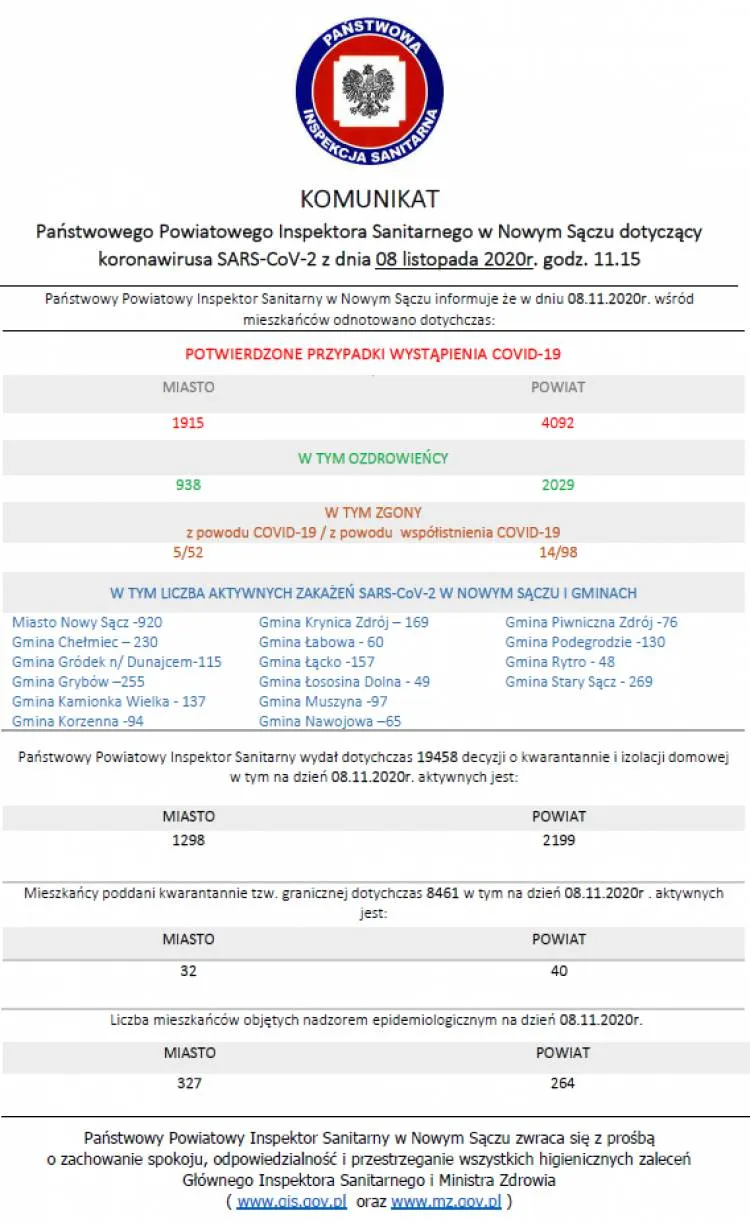 Dzisiaj na terenie powiatu nowosądeckiego odnotowano 80 kolejnych zakażeń wirusem SARS-CoV-2, a w mieście Nowy Sącz 43. Na Sądecczyźnie pojawiło się również 59 nowych ozdrowieńców. Niestety są też kolejne ofiary śmiertelne wirusa wśród których jest jedna osoba z powiatu limanowskiego. Z kolei w regionie, w powiecie limanowskim są 103 nowe zachorowania, a w powiecie gorlickim 93.