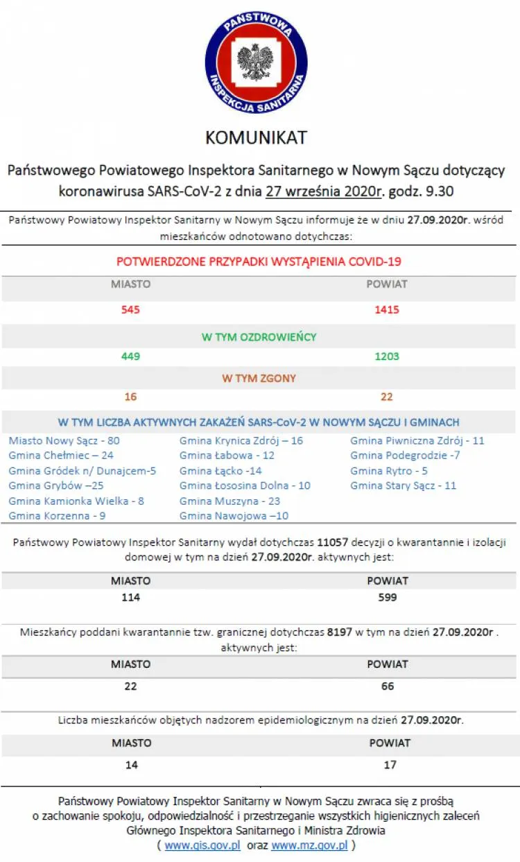 Niestety PSSE poinformowała również o śmierci 63-letniego mężczyzny, mieszkańca powiatu tatrzańskiego, który przebywał w Szpitalu Uniwersyteckim w Krakowie. Zmarły miał choroby współistniejące. Potwierdzono, że przyczyną zgonu był COVID-19. Tym samym w Małopolsce liczba zgonów spowodowanych COVID-19 wynosi 189.