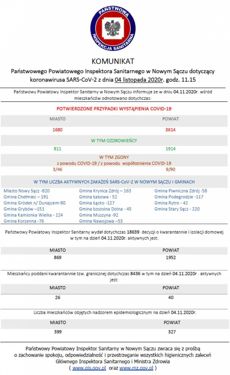 Dzisiaj na terenie powiatu nowosądeckiego odnotowano 168 kolejnych zakażeń wirusem SARS-CoV-2, a w mieście Nowy Sącz 78. Na Sądecczyźnie pojawiło się również 69 nowych ozdrowieńców. Niestety są też kolejne ofiary śmiertelne wirusa wśród których są 3 osoby z powiatu nowosądeckiego, 3 z Nowego Sącza oraz 1 z powiatu gorlickiego. Z kolei w regionie, w powiecie gorlickim jest 60 nowych zachorowań.