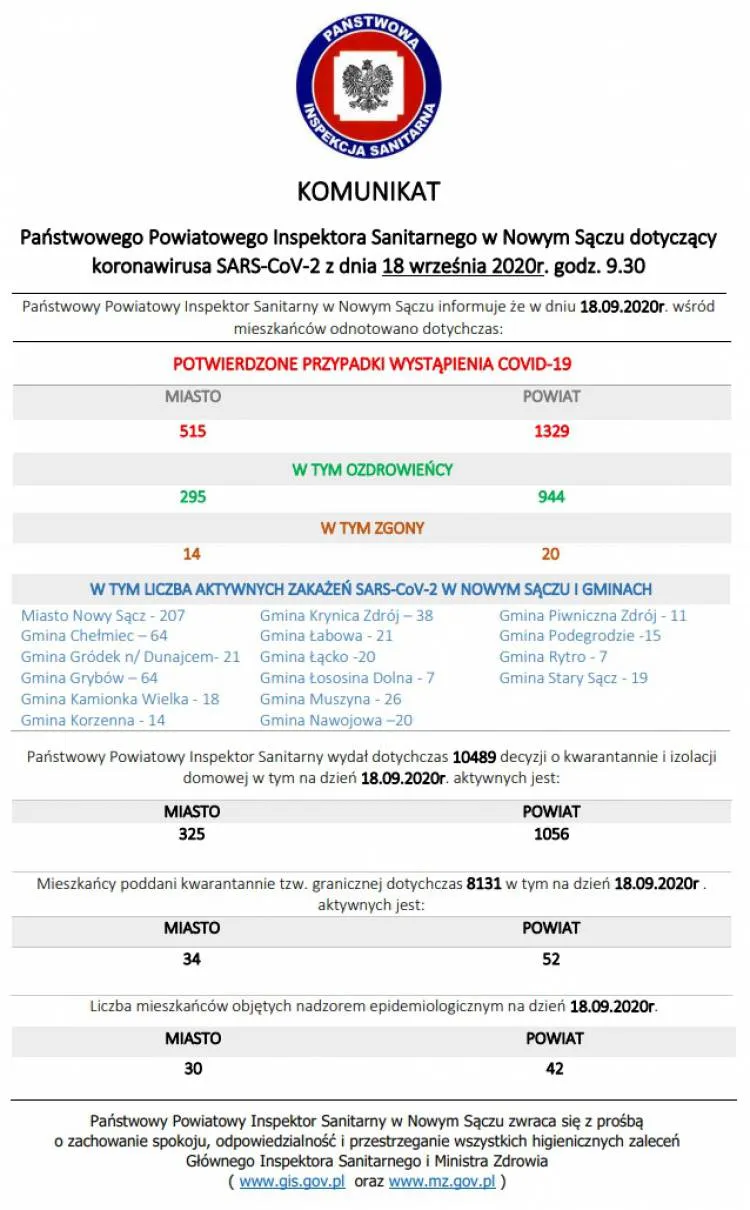 Dzisiaj na terenie powiatu nowosądeckiego odnotowano 5 kolejnych zakażeń wirusem SARS-CoV-2, a w mieście Nowy Sącz 1. Na Sądecczyźnie pojawiło się również 18 nowych ozdrowieńców. Niestety jest też kolejna ofiara śmiertelna wirusa, którą jest 70-letnia kobieta, mieszkanka Nowego Sącza, która przebywała w Szpitalu Uniwersyteckim w Krakowie. Z kolei w regionie, w powiecie limanowskim są 3 nowe zachorowania, a w powiecie gorlickim 1. Pojawiło się także 9 ozdrowieńców.