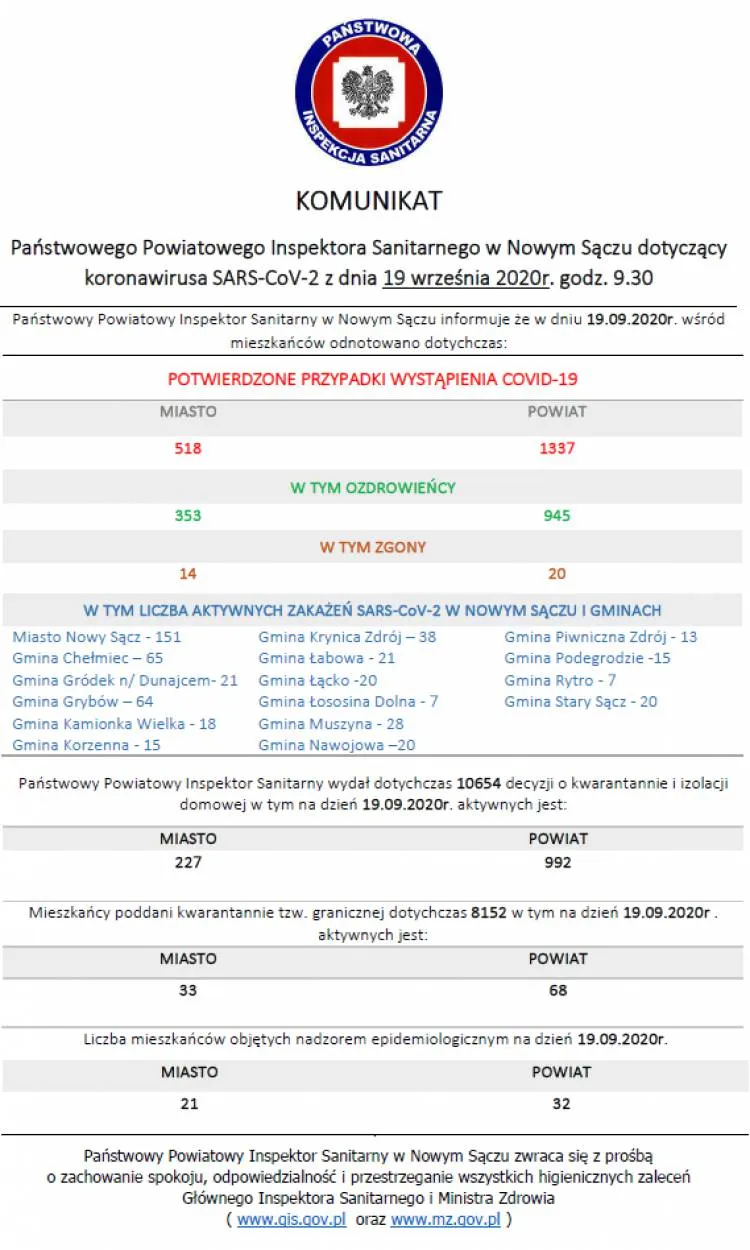 Z kolei wśród ozdrowieńców są 34 kobiety i 91 mężczyzn, w wieku od 2 do 89 lat, z Nowego Sącza (58 osób), powiatu myślenickiego (18 osób), nowotarskiego (10 osób), limanowskiego (9 osób), tatrzańskiego (5 osób), tarnowskiego i suskiego (po 4 osoby), powiatu oświęcimskiego i olkuskiego (po 3 osoby), wadowickiego, gorlickiego i bocheńskiego (po 2 osoby) oraz Krakowa i powiatów: wielickiego, nowosądeckiego, miechowskiego, krakowskiego (po 1 osobie), którzy w większości przebywali w izolacji. W sumie w Małopolsce mamy 7286 ozdrowieńców.