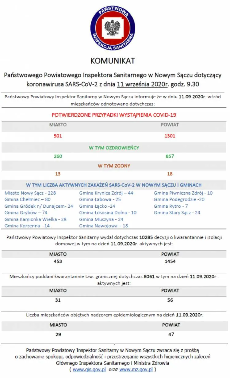 Dzisiaj na terenie powiatu nowosądeckiego odnotowano 1 kolejne zakażenie wirusem SARS-CoV-2, a w mieście Nowy Sącz żadnego. Na Sądecczyźnie pojawiło się również 30 nowych ozdrowieńców. Niestety są też trzy kolejne ofiary śmiertelne wirusa, wśród których jest 91-letnia kobieta, mieszkanka powiatu nowosądeckiego, która przebywała w Szpitalu Uniwersyteckim w Krakowie. Z kolei w regionie, w powiecie limanowskim jest 5 nowych zachorowań. Pojawiło się także 11 ozdrowieńców.
