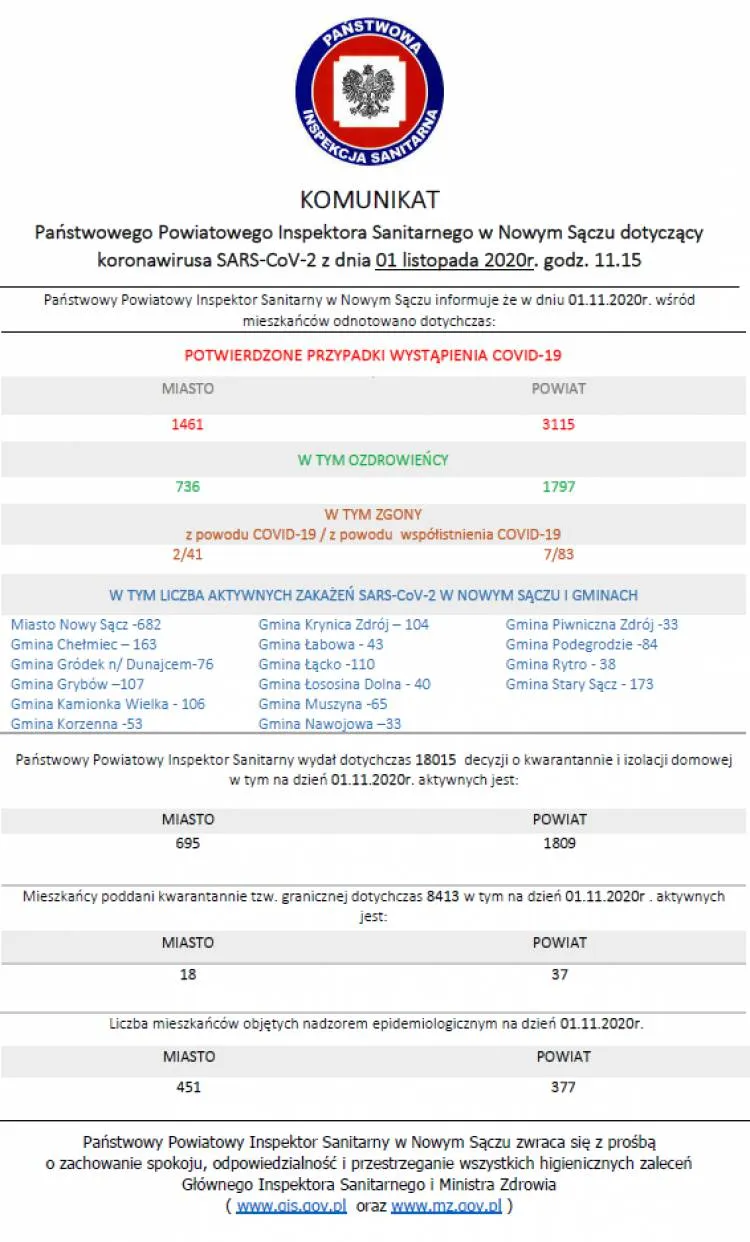 Dzisiaj na terenie powiatu nowosądeckiego odnotowano 130 kolejnych zakażeń wirusem SARS-CoV-2, a w mieście Nowy Sącz 79. Na Sądecczyźnie pojawiło się również 97 nowych ozdrowieńców. Niestety są też kolejne ofiary śmiertelne wirusa wśród których jest jedna osoba z Nowego Sącza oraz jedna z powiatu nowosądeckiego. Z kolei w regionie, w powiecie limanowskim są 44 nowe zachorowania, a w powiecie gorlickim 27. Pojawiło się także 140 ozdrowieńców.