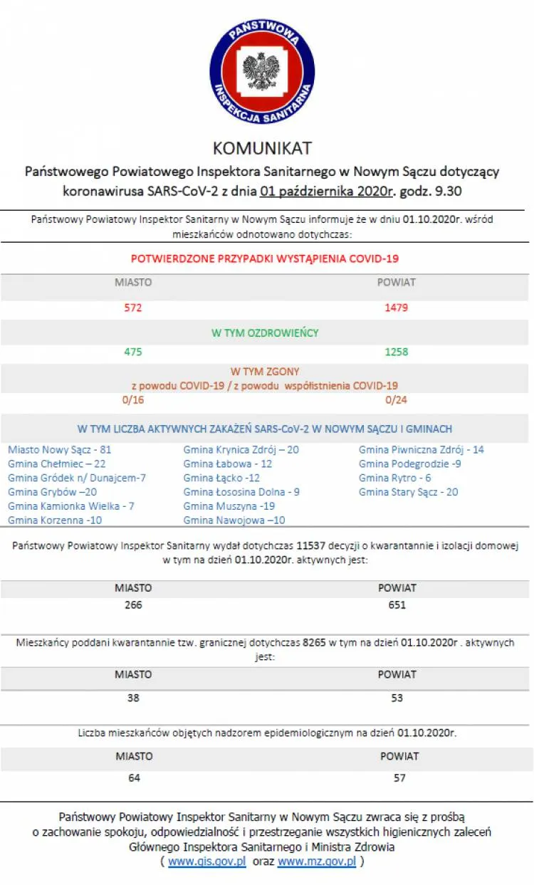 Dzisiaj na terenie powiatu nowosądeckiego odnotowano 20 kolejnych zakażeń wirusem SARS-CoV-2, a w mieście Nowy Sącz 7. Na Sądecczyźnie pojawiło się również 5 nowych ozdrowieńców. Z kolei w regionie, w powiecie limanowskim jest 29 nowych zachorowań, a w powiecie gorlickim 6. Pojawiło się także 16 ozdrowieńców.