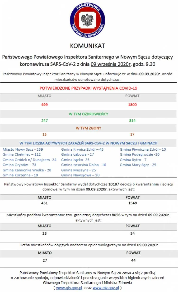 Dzisiaj na terenie powiatu nowosądeckiego odnotowano 5 kolejnych zakażeń wirusem SARS-CoV-2, a w mieście Nowy Sącz 1. Niestety jest też kolejna ofiara śmiertelna wirusa, którą jest 79-letni mężczyzna, mieszkaniec powiatu nowosądeckiego, który przebywał w Szpitalu Uniwersyteckim w Krakowie. Z kolei w regionie, w powiecie limanowskim są 2 nowe zachorowania. Pojawiło się także 14 ozdrowieńców.