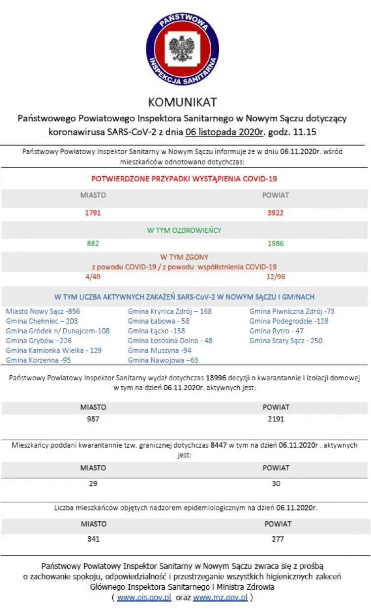 Dzisiaj na terenie powiatu nowosądeckiego odnotowano 133 kolejne zakażenia wirusem SARS-CoV-2, a w mieście Nowy Sącz 60. Na Sądecczyźnie pojawiło się również 73 nowych ozdrowieńców. Niestety są też kolejne ofiary śmiertelne wirusa wśród których jest 7 osób z powiatu nowosądeckiego, 3 z Nowego Sącza oraz 1 z powiatu gorlickiego. Z kolei w regionie, w powiecie limanowskim jest 87 nowych zachorowań, a w powiecie gorlickim 86. Pojawiło się także 93 ozdrowieńców.