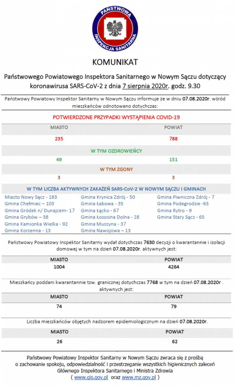 Dzisiaj na terenie powiatu nowosądeckiego odnotowano 17 kolejnych zakażeń wirusem SARS-CoV-2, a w mieście Nowy Sącz 8. Na Sądecczyźnie pojawiło się również 4 nowych ozdrowieńców. Z kolei w regionie, w powiecie limanowskim jest 30 nowych zachorowań, a w powiecie gorlickim 1. Pojawiło się także 5 ozdrowieńców.