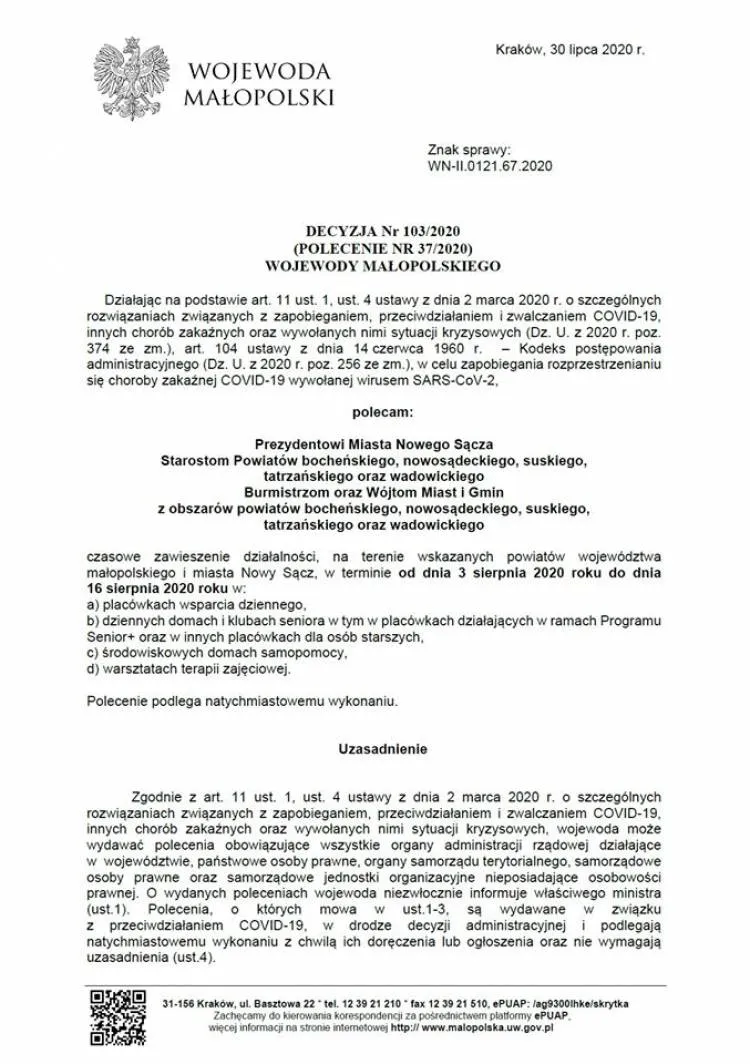 W związku z dużą liczbą zakażeń koronawirusem na terenie miasta Nowy Sącz oraz powiatów: nowosądeckiego, bocheńskiego, suskiego, tatrzańskiego oraz wadowickiego, Wojewoda Małopolski wydał decyzję o czasowym zawieszeniu działalności od 3.08.2020 - 16.08.2020 roku w: